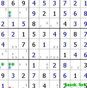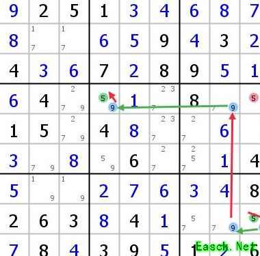R4C4与R8C9均为5,共同影响格R4C9,故可排除其中的5。