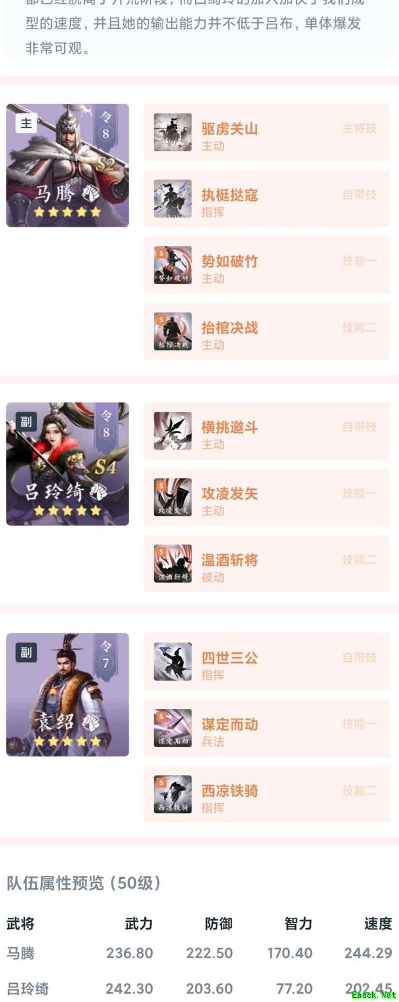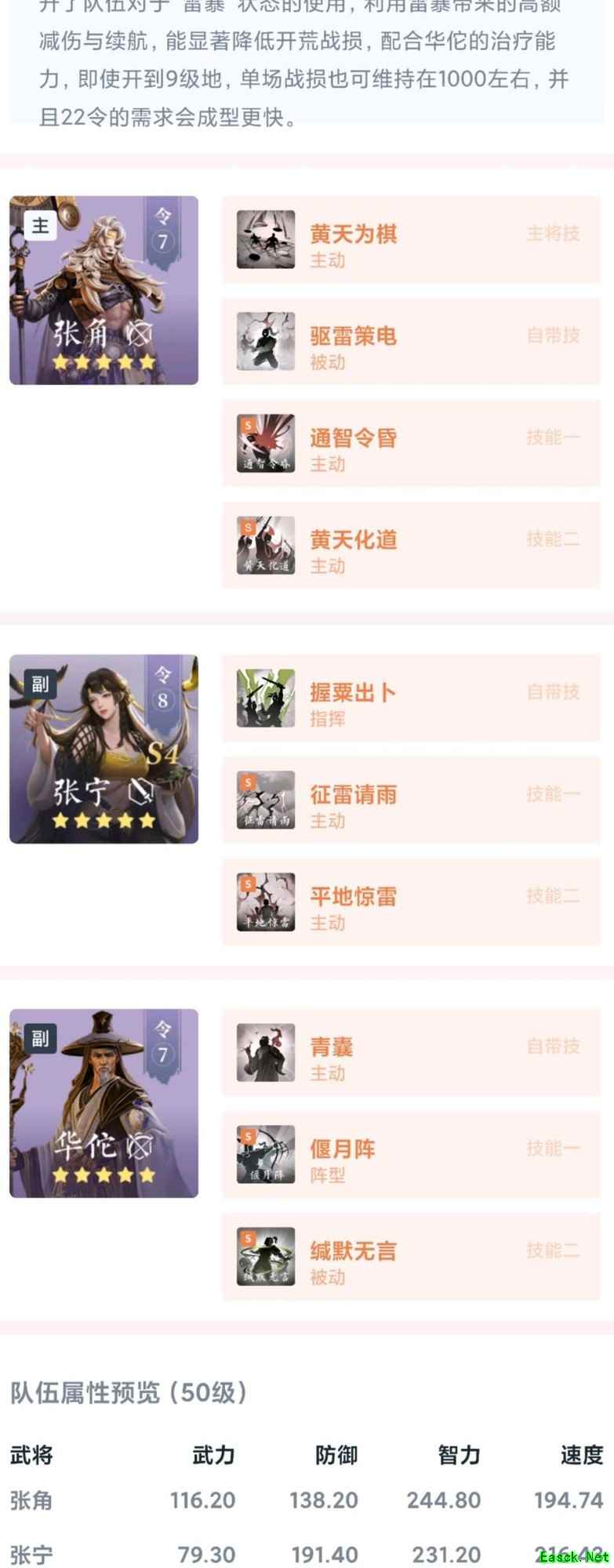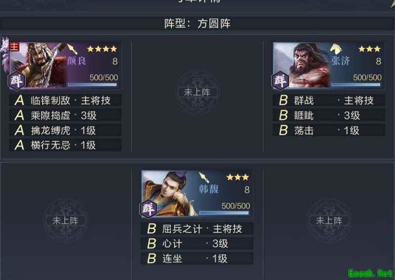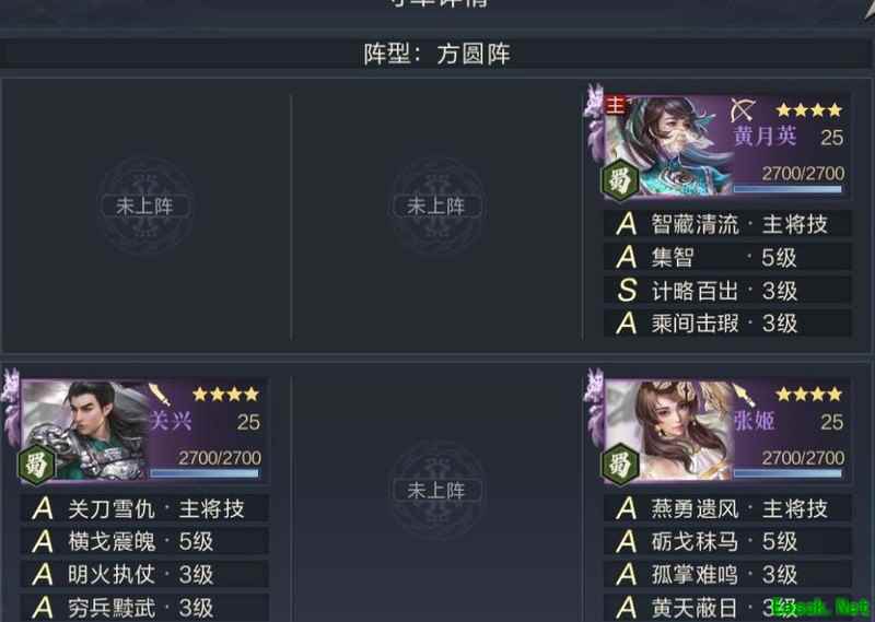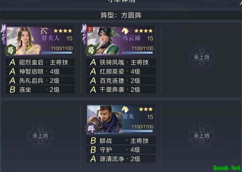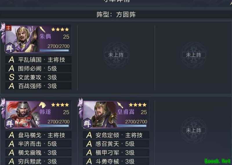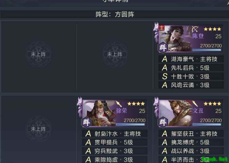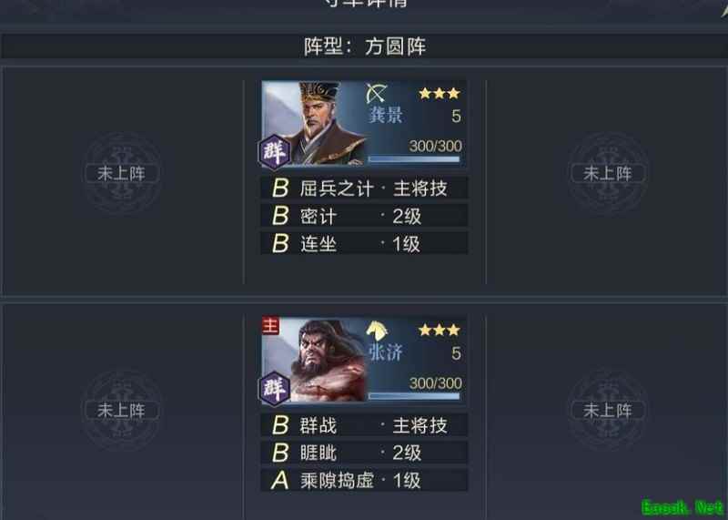 该地块两名副将共携带六个输出技能,具备减防、驱散、缴械及降低智力等控制效果;主将位于后排,拥有属性增益,并可削弱我方智力伤害,同时提升友军武力输出。整体输出强劲,战斗损耗较低,通关难度较高。初次挑战5级地时不推荐尝试,建议采用124或235阵型应对。