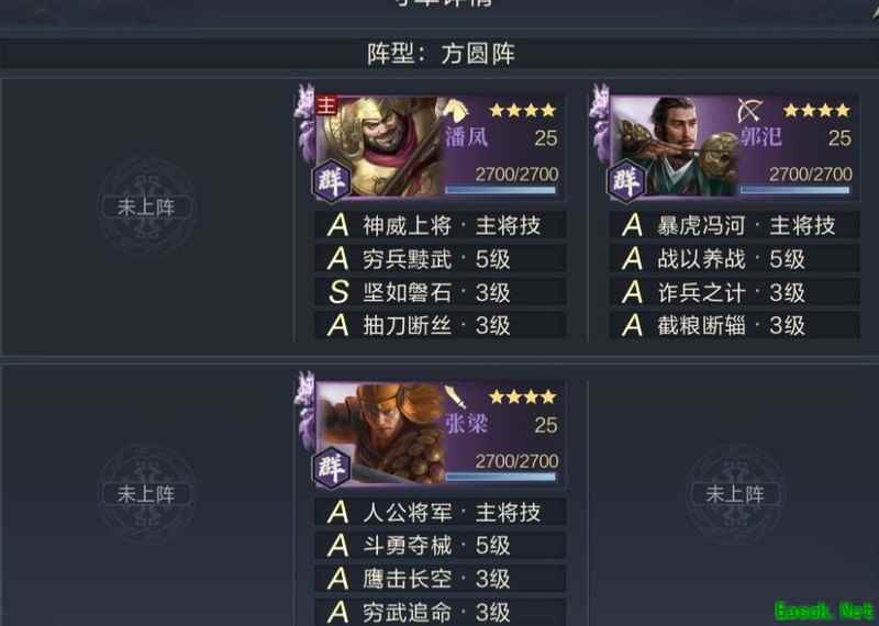 该野外队伍主将携带坚如磐石与抽刀断丝,潘凤释放技能时可能陷入力竭,输出能力较弱;副将郭汜和张梁技能伤害率偏低,且依赖前置条件触发。整体来看,此为五级地中难度最低的一类。配置较优的玩家在15级左右即可采用爆头战术攻克。推荐使用124或245阵型站位,以提升战斗效率与胜率。