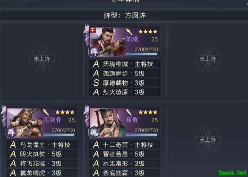 该地形对智力型队伍压制明显,敌方主将可窃取智力并削弱我方智力伤害,两名副将技能输出较强。虽整体输出不俗,但防御较弱,武力队易突破,战斗难度中等,推荐采用356或256阵型应对。