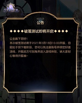 本次测试全渠道限量5W测试名额,已经完成游戏预约的公主殿下可留意测试码短信,收到邀请码的公主殿下根据短信所提示的地址下载游戏后,注册账号并绑定好激活码,待游戏正式开服后,可创建角色并进入游戏进行体验。本次测试数量名额限量发放,未获得测试资格的公主殿下也请不要灰心,随着破茧测试的开启,全平台公测也在不远的路上!记得预约游戏解锁更多惊喜预约奖励哦!