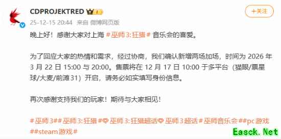今天晚上,CDPR官方微博发文宣布:晚上好!感谢大家对上海《巫师3:狂猎》音乐会的喜爱。为了回应大家的热情和需求,经过协商,我们确认新增两场加场,时间为2026年3月22日15:00与20:00!