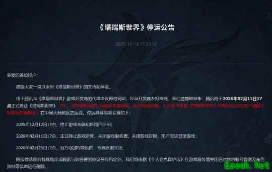 腾讯MMORPG《塔瑞斯世界》国际服停服后,国服也宣布将于2026年2月11日停服,2025年12月12日起停止充值及新用户注册。本作于2024年6月12日公测,运营不足一年半。