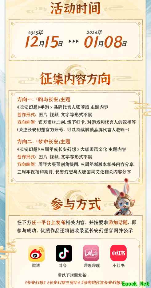 游戏外,UGC二创活动也在全平台开启。围绕《长安幻想》手游品牌代言人张若昀方向或《长安幻想》三周年及长安文化,在微博、抖音、B站、小红书任一平台上分享相关内容,并添加指定话题,即可成功参与活动,有机会获得代言签名照、代言周边、华为手表、华为耳机等奖品。