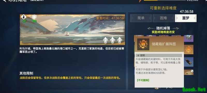 单人挑战冰封海港,每次刷新出7张普通卡,消耗46体力,储藏箱扩展阵图可掉落12张,另有Boss奖励。