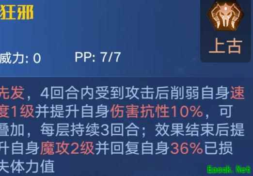 释放三技能后,若在接下来的4回合内受到伤害,将降低自身速度1级并提高伤害抗性;效果持续满4回合(含施法当回合)结束后,提升魔攻2级并恢复生命值。