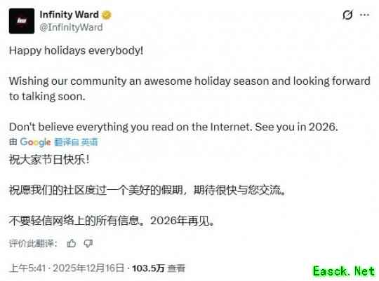 在该篇节日祝福贴文中,工作室写道:“祝大家节日快乐!愿我们的社区度过一个美好的假期,期待不久后与大家交流。请不要相信你在互联网上读到的一切。2026年见。”尽管未直接点名,此举普遍被视为对近期传闻的间接回应。