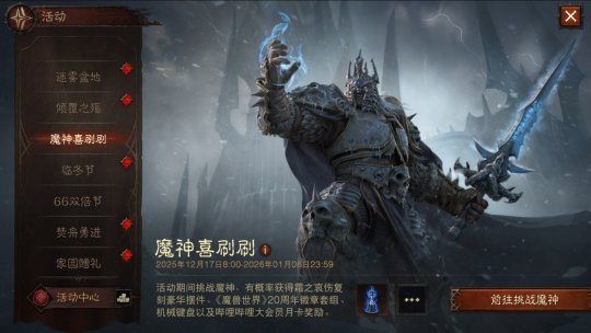 魔兽联动“魔神喜刷刷”限时活动现已上线,完成魔神挑战,即有机会赢取“霜之哀伤1:1复刻摆件”等魔兽周边,以及哔哩哔哩大会员等惊喜奖励。