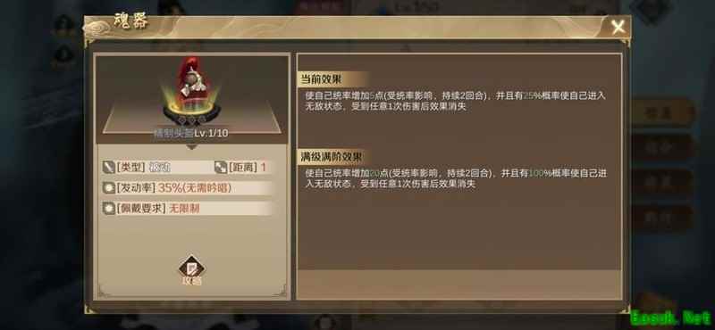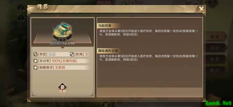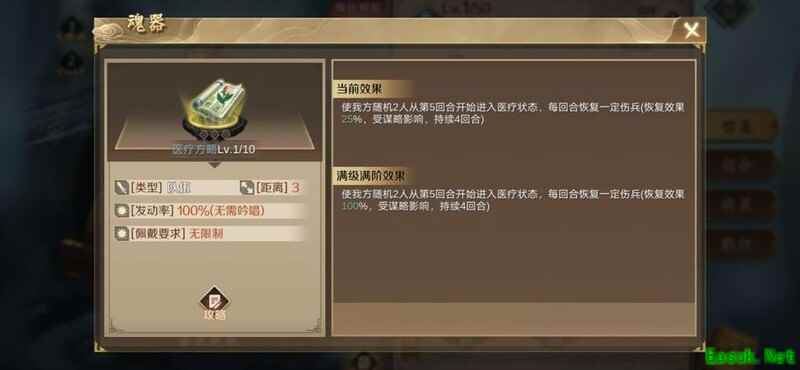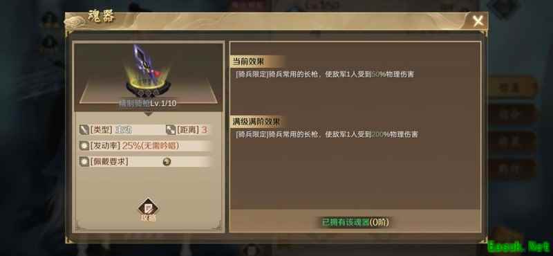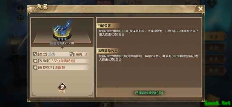 该魂器拥有50%释放几率和最高200%的伤害加成,任何武将使用都极为强势,尤其推荐原因在于其独有的百分百提升攻击距离的属性,极大增强作战灵活性。