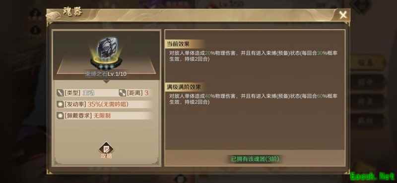 此魂器虽无额外伤害,但控制能力突出,满级时可施加高达百分之六十的束缚效果,使目标无法进行普通攻击,实用性极强。