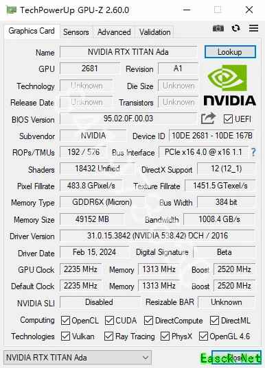GPU-Z识别信息显示,该卡使用了满血版AD102芯片,开放全部1843个CUDA核心、576个纹理单元、192个ROP单元。
