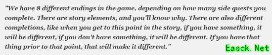 他进一步解释道:“游戏一共有8种不同的结局,取决于你完成了多少支线任务。有些剧情节点,如果你拥有某样东西,结果会不同;如果没有,又是另一种走向。如果你在此之前就获得了它,变化也会不一样。”