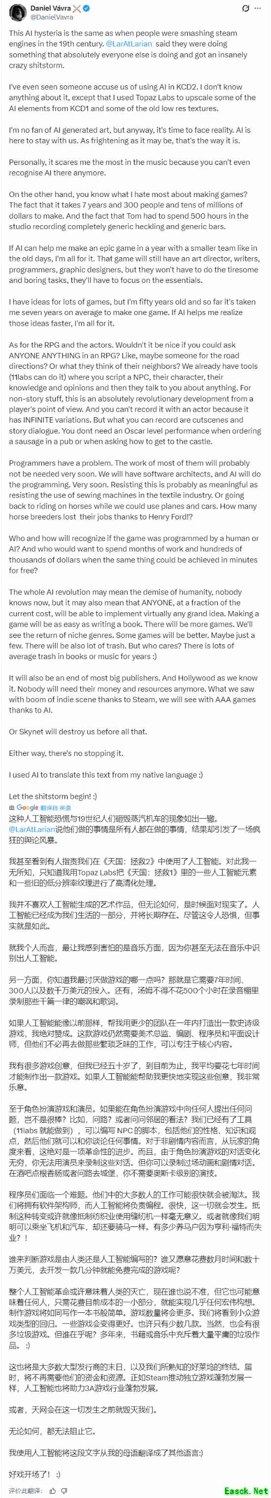 不过,正如网络舆论常见的失控方式一样,拉瑞安目前仍在社交媒体上承受不小的压力。但与此同时,不少玩家和业内开发者也开始为这家屡获大奖的工作室辩护,其中就包括《天国:拯救2》的主创丹尼尔·瓦夫拉(Daniel Vávra)。