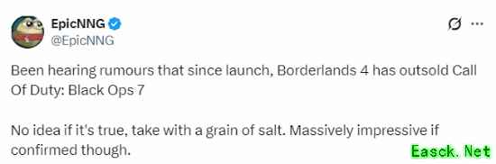 “最近一直听说,自发售以来,《无主之地4》的销量已经超过了《使命召唤:黑色行动7》。不知道是真是假,请理性看待。如果最终被证实,那将是非常惊人的成绩。”
