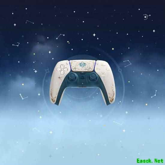 DualSense®无线控制器 -《原神》限定版控制器饰有双子旅行者空与荧的徽章,以及他们信赖的旅伴派蒙的图案。梦幻的白色、金色与绿色调交织,点缀着奇幻领域的秘法符文。