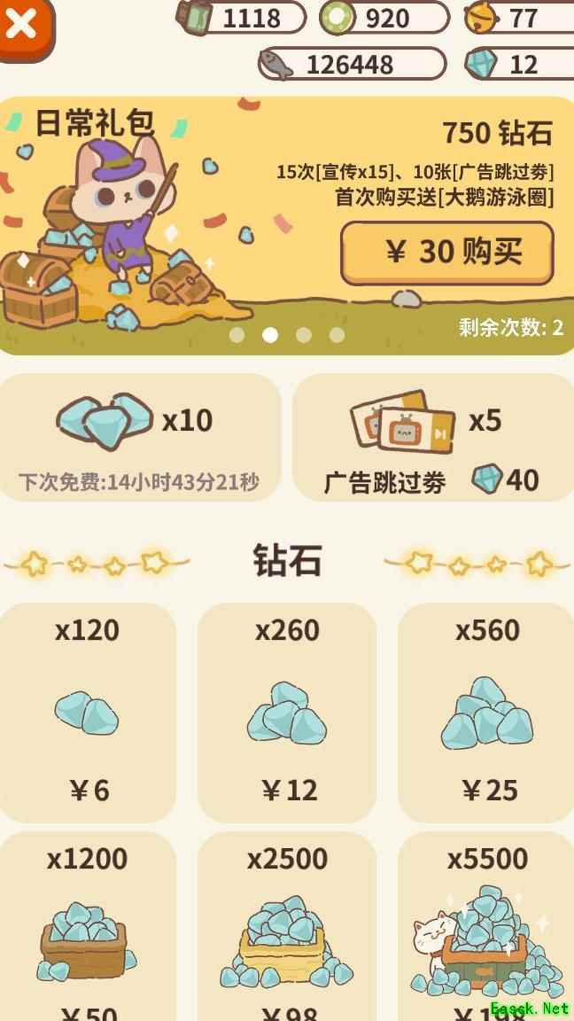点击小鱼干上的加号,每日可领取30钻石,对零氪玩家十分实用,务必记得领取,千万别错过这个福利。