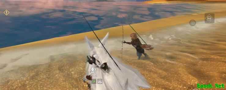 钓鱼时使用鱼竿会自动切换至第一人称视角,可调整视线角度,将鱼竿向远处抛投,随后静待鱼儿上钩。当鱼咬钩时,界面会提示上钩信息,此时迅速点击拉竿按钮,持续填充进度条,直至满格即可成功将鱼捕获并拉出水面,完成整个钓鱼过程。