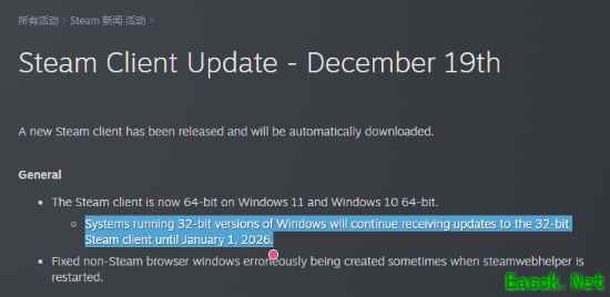 公告关于steam系统的更新中,V社表示,目前32位的Steam客户端将在26年1月1日停止更新。不过,当前64位版Steam不仅支持Windows 11,同时还会继续支持Windows 10。