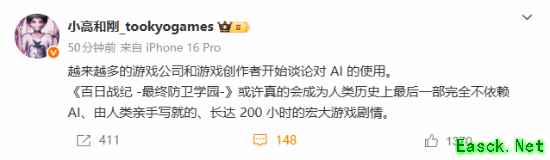今天下午,小高和刚在微博发文表示,最近越来越多的游戏公司和游戏创作者都开始谈论有关“使用AI”的话题。他声称:“《百日战纪 -最终防卫学园-》或许真的会成为人类历史上最后一部完全不依赖AI、由人类亲手写就的、长达200小时的宏大游戏剧情!”