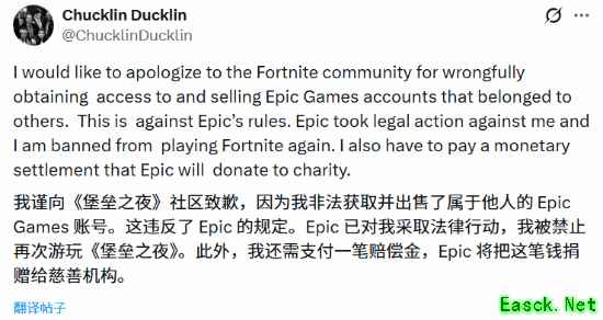 经过数月的法律程序,斯特罗克被迫通过其账号Chucklin Ducklin在X(原Twitter)上发布公开道歉声明。他写道:“我想向《堡垒之夜》社区为我非法访问和出售属于他人的Epic Games账户道歉。这违反了Epic的规定。该公司已采取法律行动,我再次被禁止游玩《堡垒之夜》。我还需支付一笔赔偿金,Epic将把这笔钱捐赠给慈善机构。”
