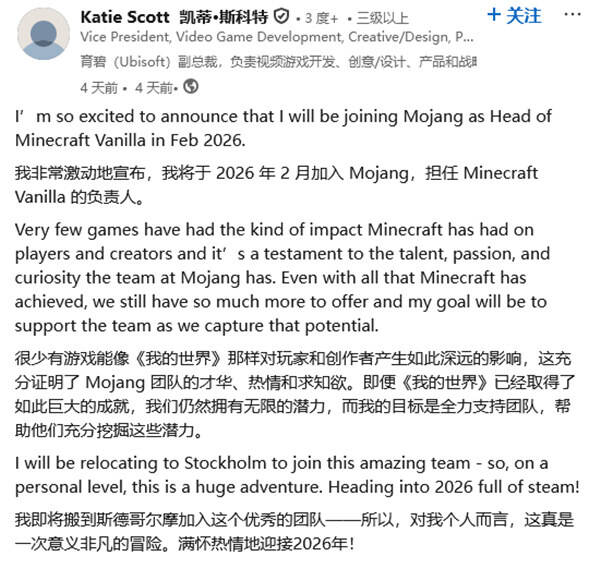 游戏行业重磅人事变动!育碧全球创意办公室副总裁 Katie Scott 近日在领英官宣,将于 2026 年 2 月正式加盟微软旗下《我的世界》开发商 Mojang,出任原版《我的世界》项目负责人。这位横跨育碧、EA、The Coalition 三大顶尖厂商的行业老兵,不仅手握《战争机器 5》等爆款项目经验,更以多元化、包容性与无障碍设计的积极倡导著称,此次跨界掌舵全球顶流 IP,引发行业广泛关注。