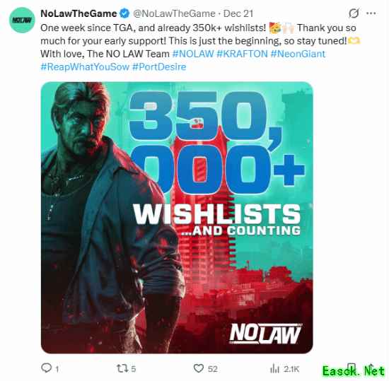 在2025年TGA颁奖典礼上惊艳亮相的3A开放世界生存游戏《NOLAW》,近日再传捷报:首曝首周,其Steam愿望单数量已突破30万,可见玩家对这款由《PUBG》发行商KRAFTON与瑞典知名工作室NeonGiant强强联手之作的高度期待。
