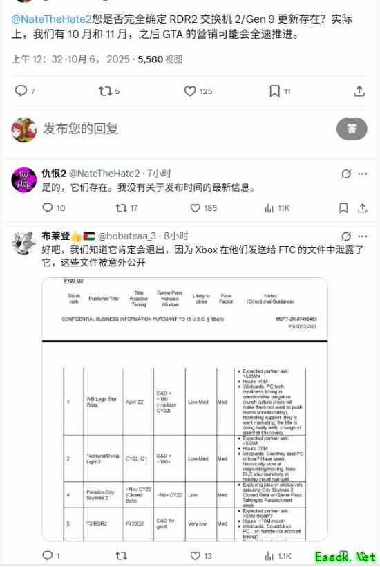早在十月,推特用户@NateTheHate2声称目前《荒野大镖客:救赎2》增强版正在推进,其评论下也有人晒出了XBOX的内部文件。