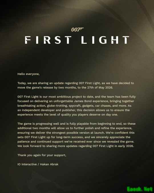 《007:初露锋芒》原定于2026年3月27日发售,登陆PC/PS5/XSX|S平台。现在IO Interactive宣布本作延期两个月,将于2026年5月27日发售。