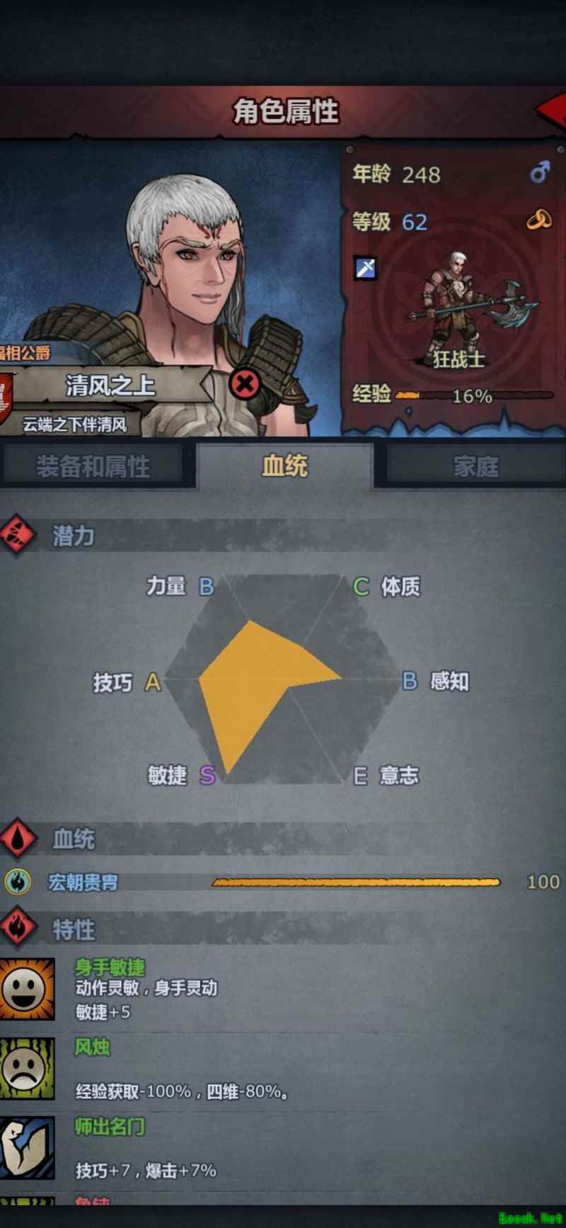技巧与敏捷属性表现突出,通常能同时达到较高水平,配合常规高血宏朝配置,轻松实现三项优质属性。力量虽多为B级,但凭借狂战士自身的成长优势及装备加持,输出完全足够。唯一短板在于体质,E级体质几乎是宏朝角色的普遍设定,公爵阶层也大多如此。一般以30级为分界点,达到后便可装备大部分强力物品。