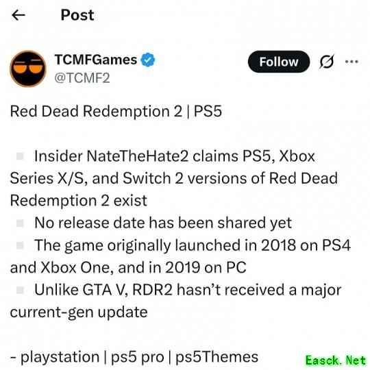 知名内部人士再次放出消息,引发玩家社区热议,这次的焦点依然是Rockstar Games旗下备受喜爱的作品之一。《荒野大镖客2》相关情报显示,可靠度颇高的爆料人NateTheHate2声称,已经存在针对PlayStation5、Xbox Series X/S,包括Nintendo Switch2优化的版本。