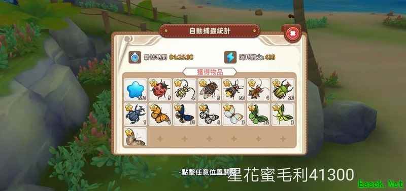 从图中可以看出,入门花蜜挂机的总收益为30880金币,花蜜成本为10次×175金币=1750金币。消耗体力525点,经减免后实际消耗417点,共减免108点体力。由此可测算出相关效率与收益比例。