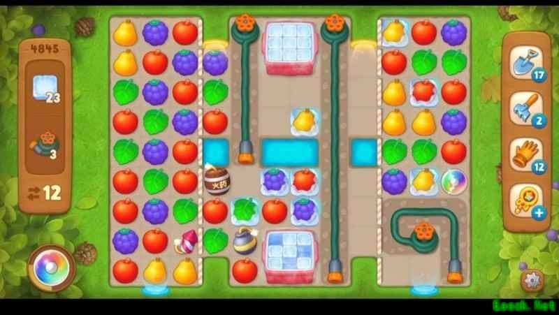 梦幻花园第4845关挑战升级!高难度布局分三区,26冰块+4水管限时24步内完成。巧妙利用炸弹与彩虹球,逐破长水管,打通传送通道,策略引爆是关键!