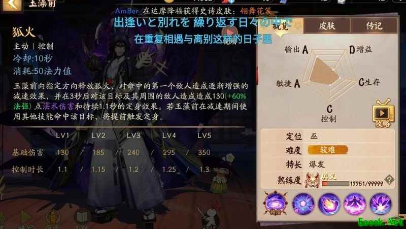 玉藻前朝指定方向释放狐火,对首个命中的敌人造成130(+60%法强)点法术伤害,并附加持续增强的减速。若在减速期间,玉藻前用其他技能再次命中该目标,则立即触发定身效果;否则3秒后自动对目标及周围敌人造成1.1秒定身。