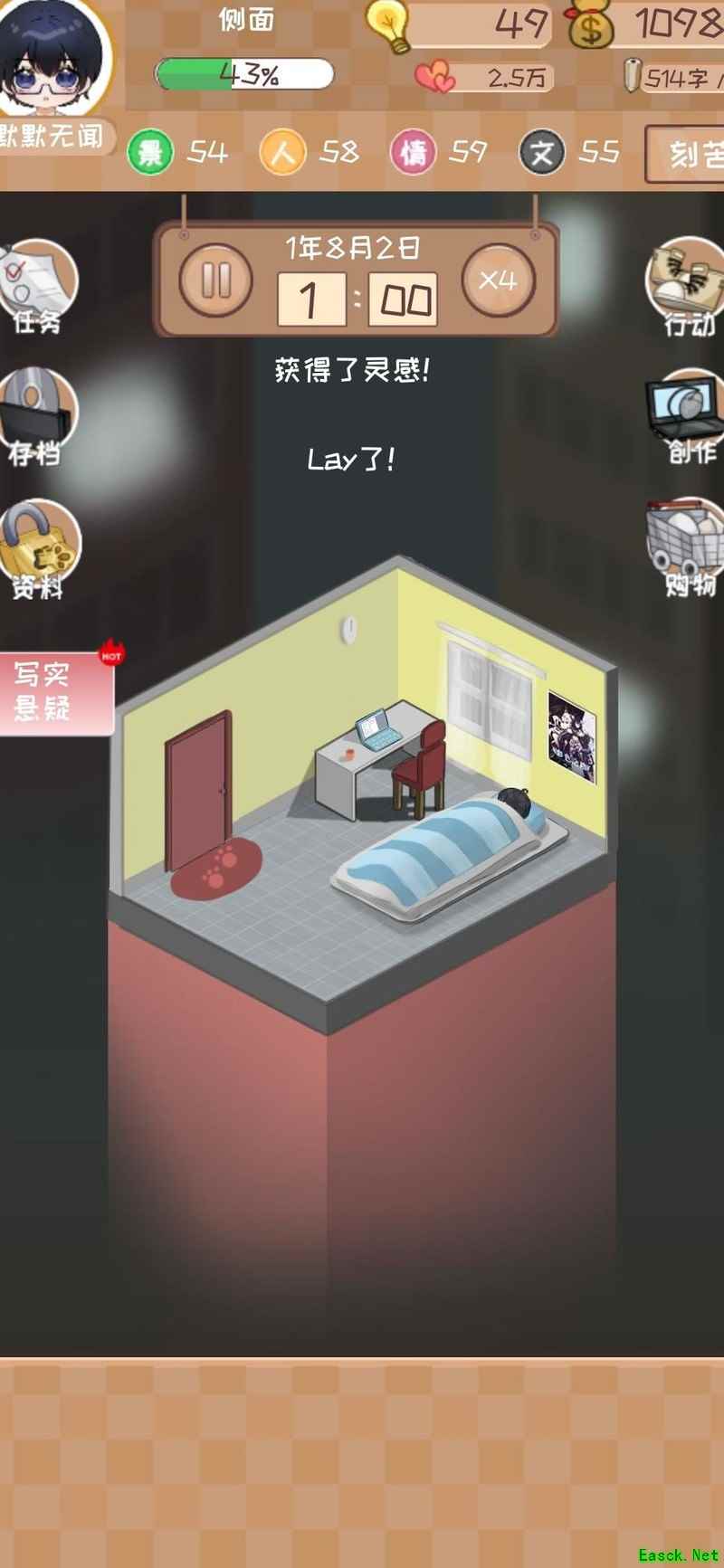 观看广告或使用手机积累灵感至30点以上,开局优先选择沉淀与迎合策略以吸引粉丝。继续经营首个网站,若各项属性均达50点以上,可直接使用灵感加成(当四维超过50时,首站评分提升10)。在首个网站赚取超过50000资金后,即可购置房产。