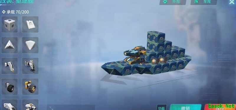 所示,这艘护卫舰的武器系统只需合理配置几门自动瞄准火炮即可,注意将侧面火炮更换为舰炮外观皮肤,整体布局应协调美观。