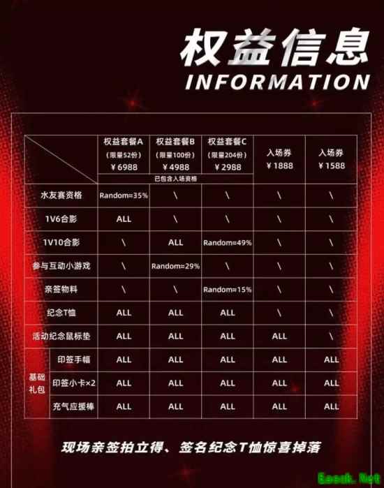 所有的档位都可以获得包括印签手幅、印签小卡和充气应援棒在内的基础礼包。1888档位起会获得活动纪念鼠标垫。2988档位起将会获得纪念T恤,该档限量204份,还有49%概率获得1v10合影机会,15%的概率获得亲签物料。4988档位则百分百获得1v10合影机会,还有29%的概率参加互动小游戏,该档限量100份。6988档位则可以进行1v6合影,另外还有35%的概率获得参加水友赛的资格,该档共有52份。