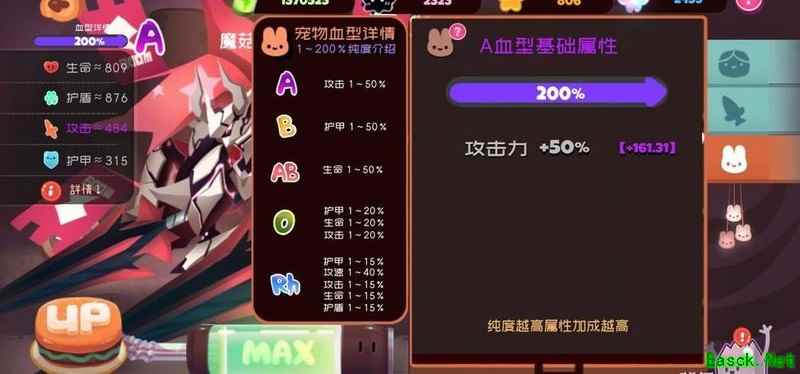 主C型宠物建议优先选择A型血,搭配方糖提升攻击力与适当攻速;菇菇虫可考虑Rh血,侧重暴击伤害。注意纯堆攻速可能导致单次伤害不足,难以破防,使主C输出效率大幅下降。