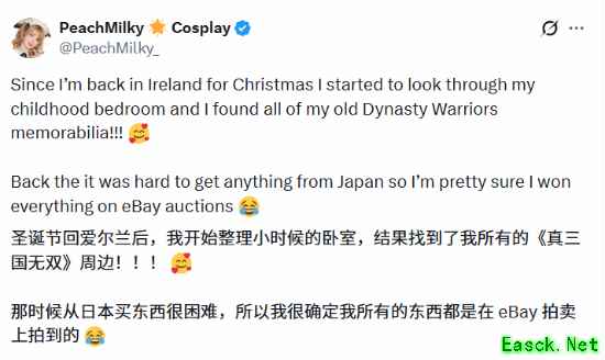 12月25日圣诞节期间,回到爱尔兰老家过年的 PeachMilky 在整理童年卧室时,意外翻出了一大堆极其珍贵的《真三国无双》周边收藏。她兴奋地在社交媒体上分享了这波“回忆杀”。