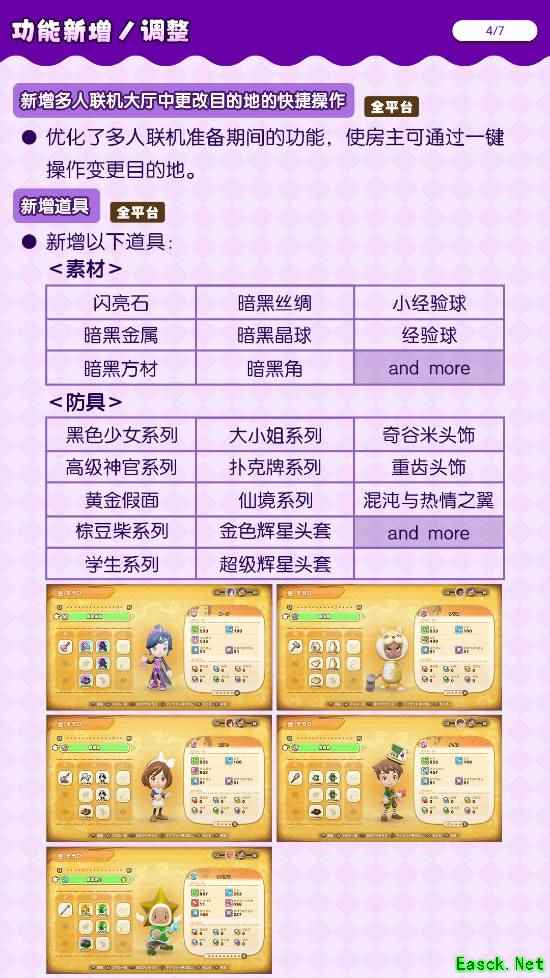 新增闪亮石、暗黑系列素材;黑色少女 / 扑克牌等系列防具;小飞艇模型、雷姆玩偶等装饰物;海盗桥 / 森林房屋等设施外观。