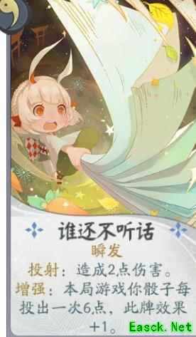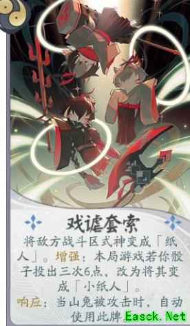 戏谑套索是这套卡组中最优质的单体解牌,在未能抽到觉醒山兔与萌即正义配合之前,它是我们应对高威胁式神的核心手段。面对诸如鬼王、酒吞童子在神子加持后的强化形态,或处于心技一体、心剑乱舞状态的犬神,以及拥有迁怒能力的茨木童子等高攻高血单位,戏谑套索都能有效将其清除。常规操作中,可先使用一次增强后的谁还不听话,再召唤纸人,利用其效果完成斩杀。若己方犬神或青蛙瓷器具备足够生存能力,也可直接攻击纸人触发效果。纸人基础属性为3力量与3生命值;而当我方累计投出三次六点骰子后,纸人将转化为小纸人,属性变为0力量与1生命值,这一变化也会影响后续战术执行与资源调度。