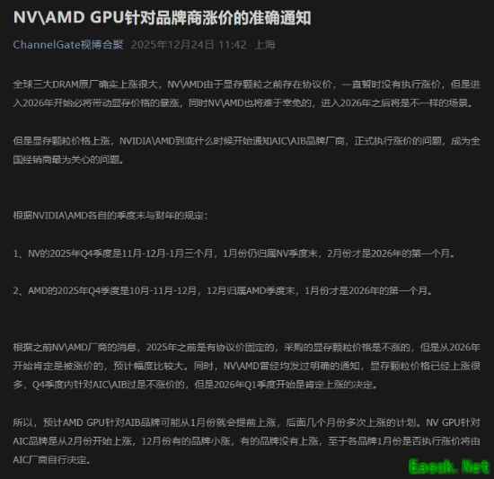 据消息媒体ChannelGate视博合聚爆料称,英伟达和AMD的显卡会在2026年逐步执行涨价。