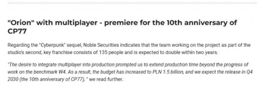 一位波兰分析师预测,代号为“猎户座计划”(Project Orion)的《赛博朋克2077》续作将于2030年Q4发售。与原作不同的是,续作首发将包含多人游戏模式。