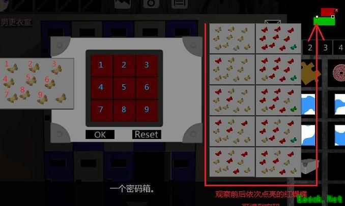 将蝴蝶图案视为九宫格(排除绿色蝴蝶),根据红蝴蝶依次出现的位置推导出密码。按153948267顺序解开密码箱,可取得。
