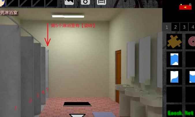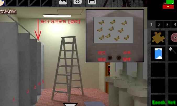 返回一楼女淋浴间,点击浴室发现蝴蝶图案,在第四个隔间取得瓷砖。