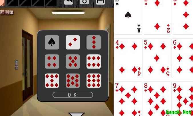 点击左侧门上的扑克牌密码锁,首先亮起的是黑桃A(实际为方片9)。