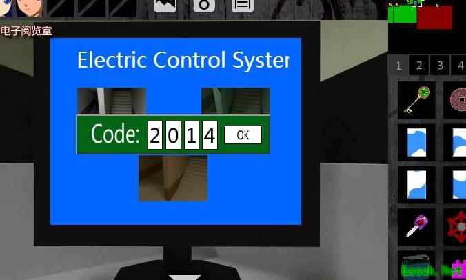 返回二楼电子阅览室,操作右侧电网控制系统,输入密码2014,解除东侧走廊的电网封锁。