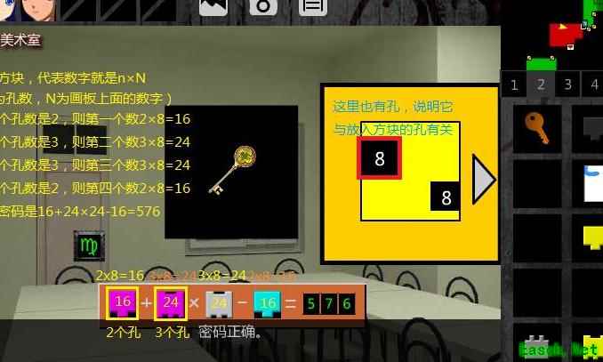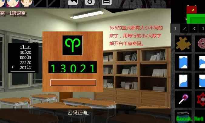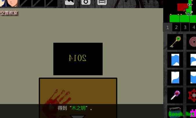 返回二楼东侧走廊,操作密码器输入0807解开机关,进入二楼空置教室。需先与凌紫会面方可开启此门。将放入指定位置,取得,同时出现倒显密码2014。