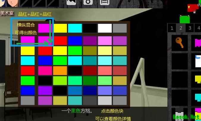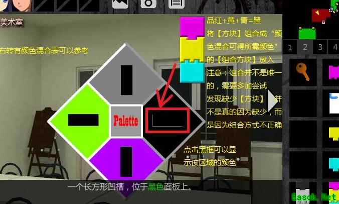 向右转,取回右侧调色板机关中的并将其分解,此时应获得12个。若数量不足,请依次返回1F外廊(黑上)、3F语音室(品红上)及1F游泳池(白中)仔细查找补全。