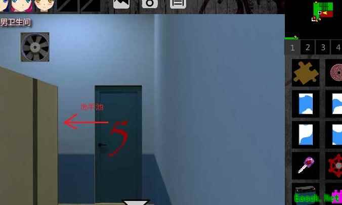 出门后点击天花板活板门,安装手柄,进入二楼男淋浴间。