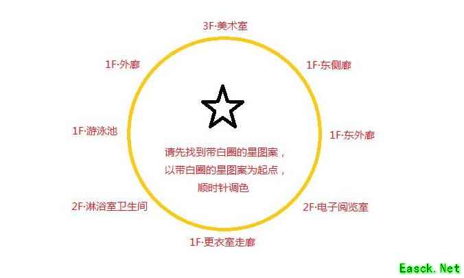 其中一个带有白色外圈,位置随机,以其为起点,按顺时针方向调整颜色,进入2F?平台,颜色顺序需依次进行。